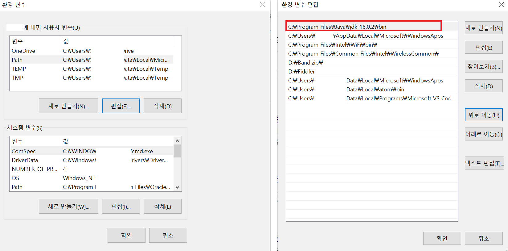 *사용자 변수 편집 > javap 툴이 있는 경로 추가하고 > 가장 위로 이동