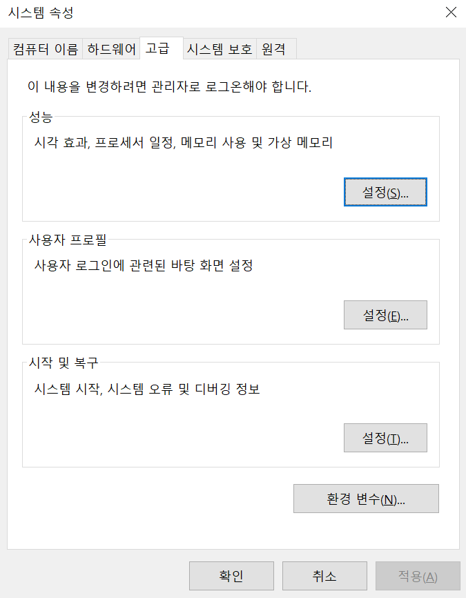 * 시스템 속성 > 환경 변수에서 설정해주면 된다.
