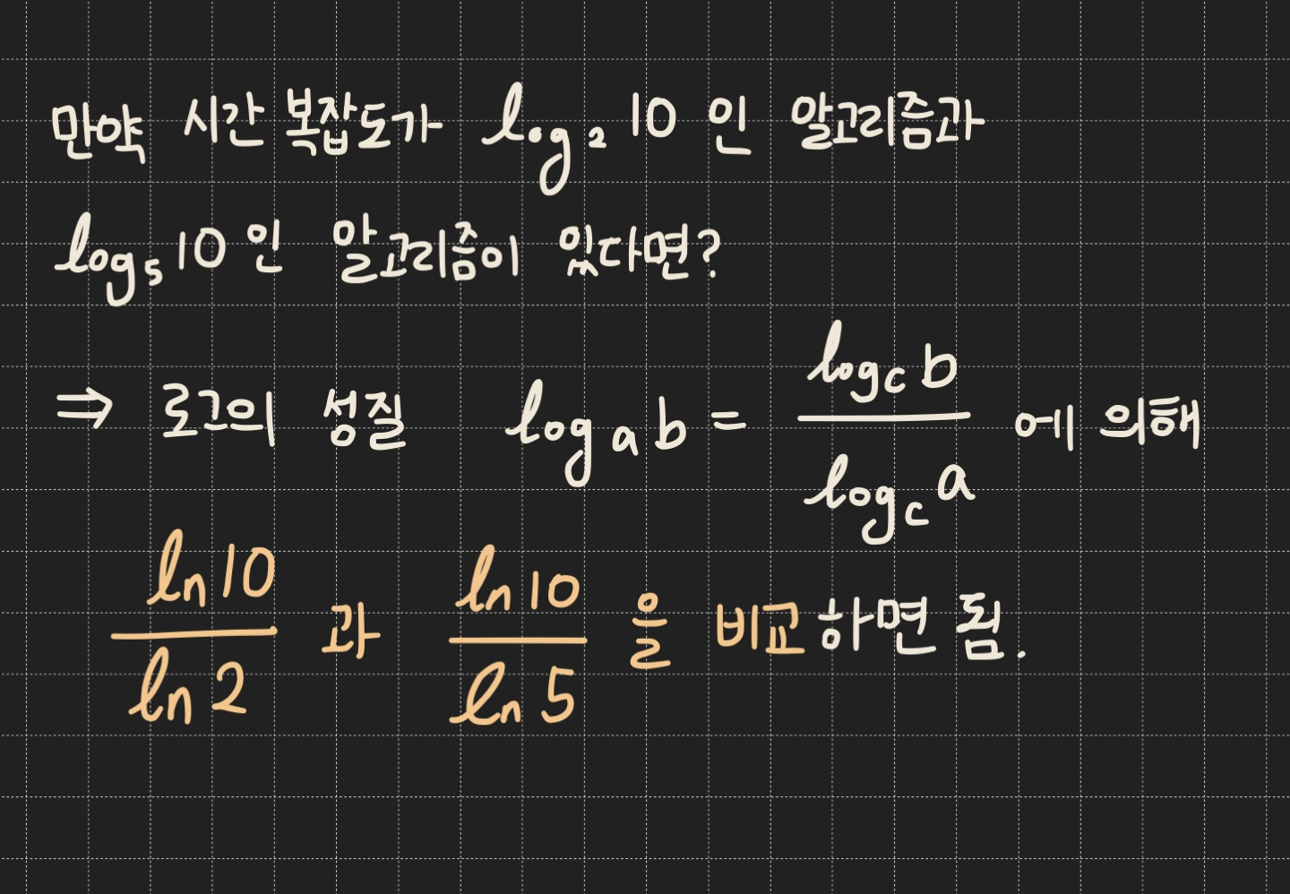 → 중요한 점은 "시간 복잡도에 대해서 이야기할 때 로그의 밑을 무시"한다고 말하는 것임