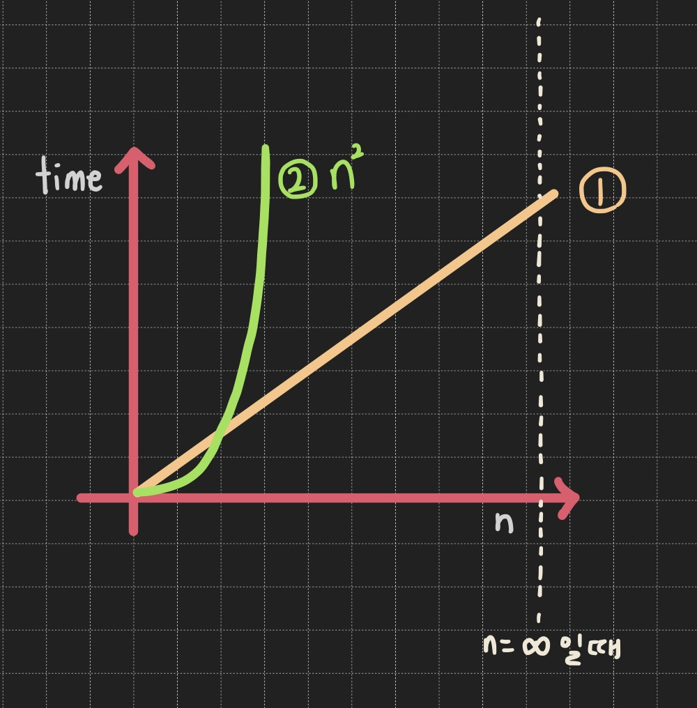 → 즉, n과 n^2 알고리즘이 있는 상태이고, 두 그래프가 만나는 지점은 n=1일 때일 것임