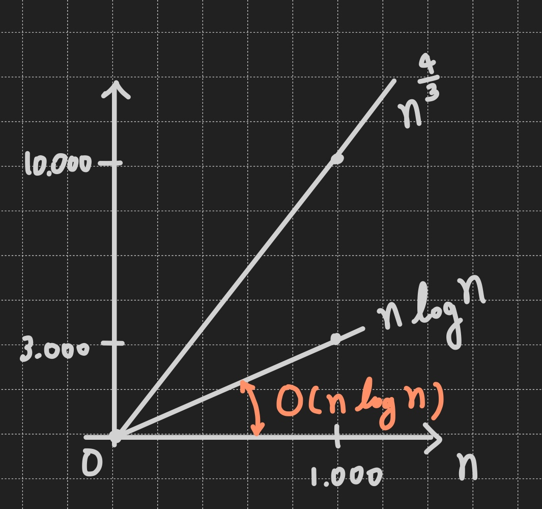→ 그래프를 보면 알 수 있듯이 n^(4/3)은 O(nlogn)의 범위에 포함되지 않음