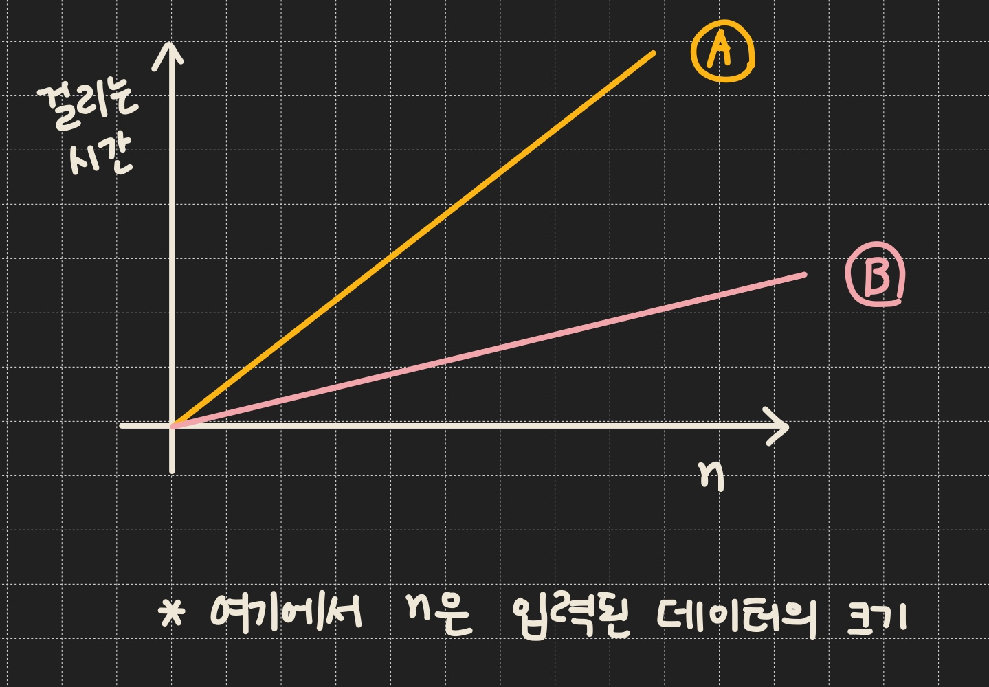 → 같은 크기의 데이터(n)를 처리하는데 그래프 B가 그래프 A보다 더 적은 시간이 걸림 (= 그래프B가 더 빠른 알고리즘)