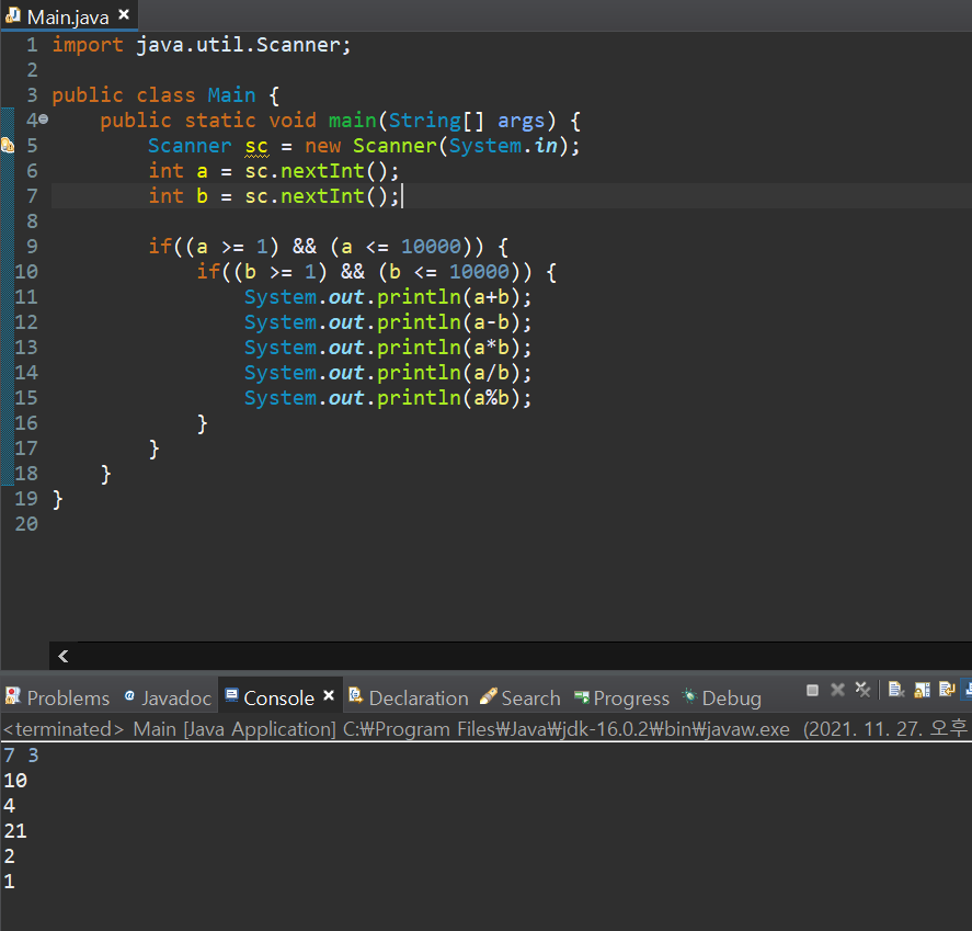 두 자연수 A와 B가 주어진다. 이때, A+B, A-B, A*B, A/B(몫), A%B(나머지)를 출력하는 프로그램을 작성하시오.