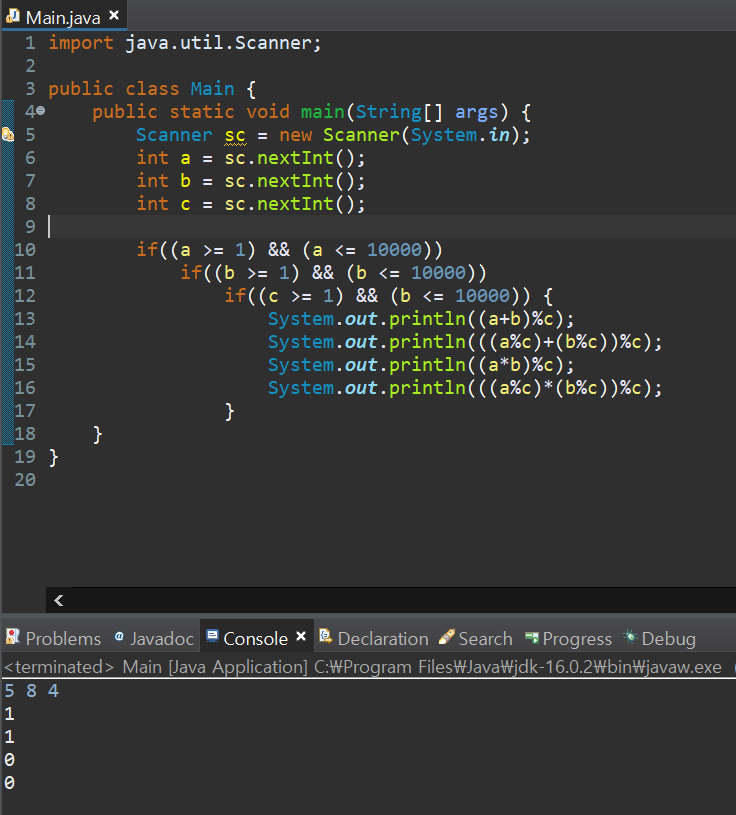 첫째 줄에 A, B, C가 순서대로 주어진다. (2 ≤ A, B, C ≤ 10000)