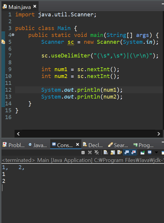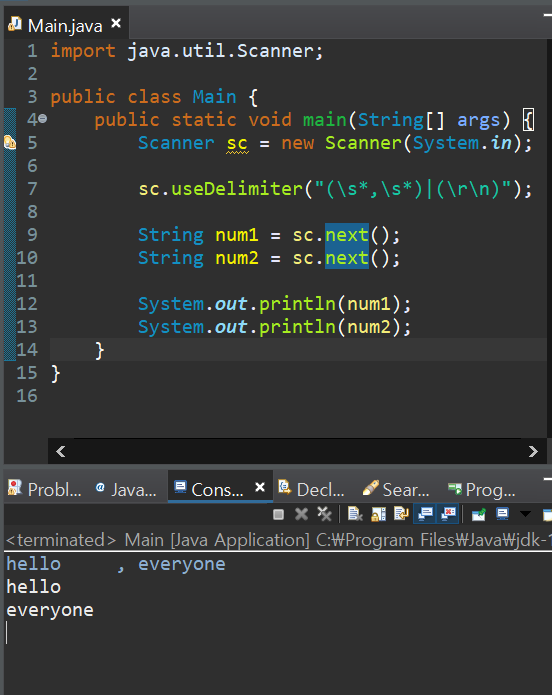 sc.useDelimiter("(\s*,\s*)|(\r\n)");