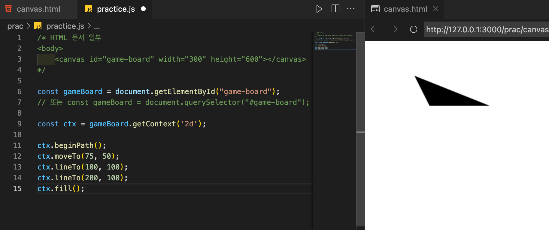 일단 가장 기본이 되는 HTML 문서에 <canvas> 태그를 넣는 것은 성공했다.